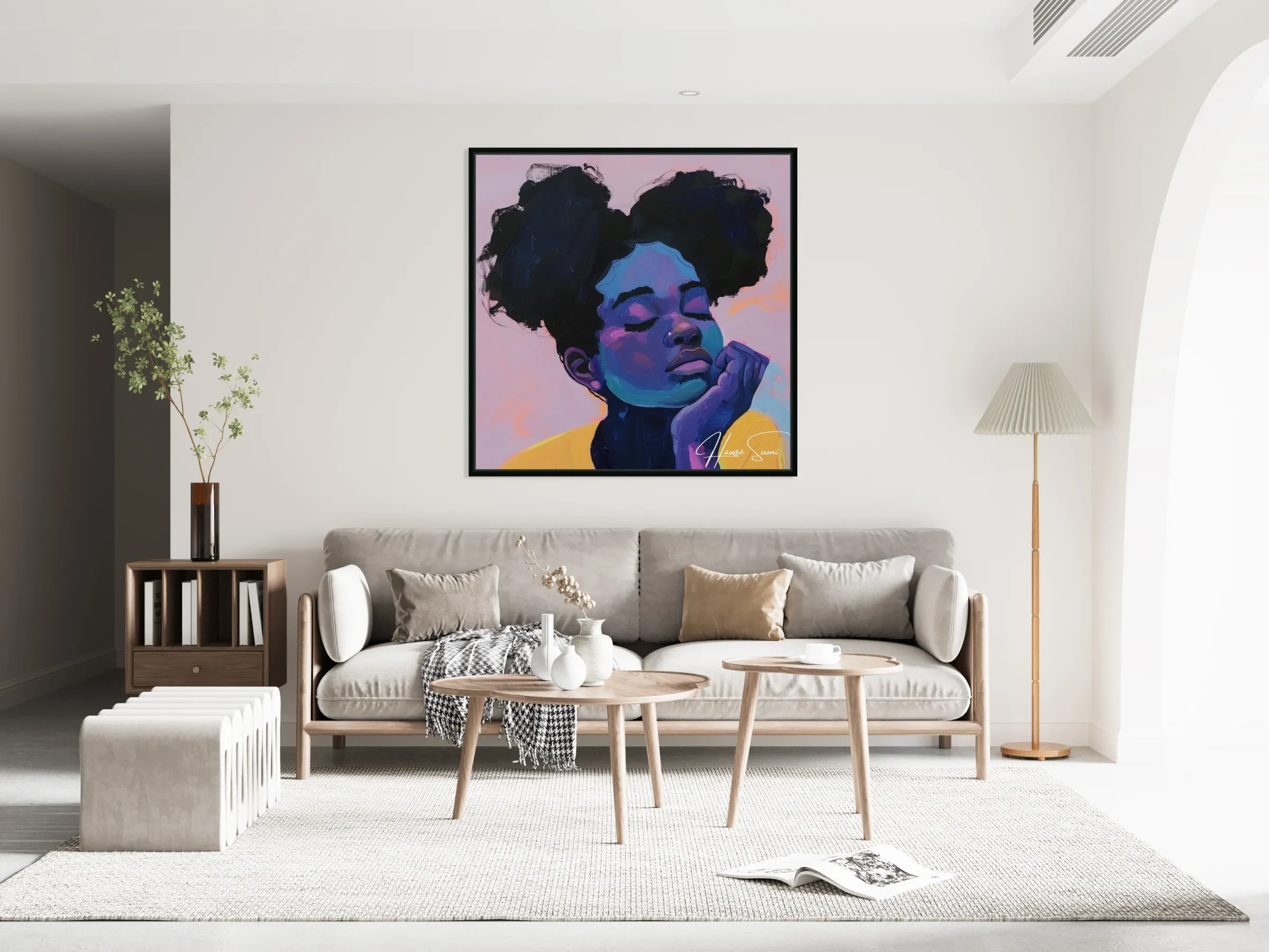This painting, titled "Dreamy Serenity," evokes a sense of calm and tranquility. The pastel tones of pink, blue, and lavender envelop the subject, who appears to be lost in a serene daydream. The abstract nature of the piece enhances its ethereal quality.
