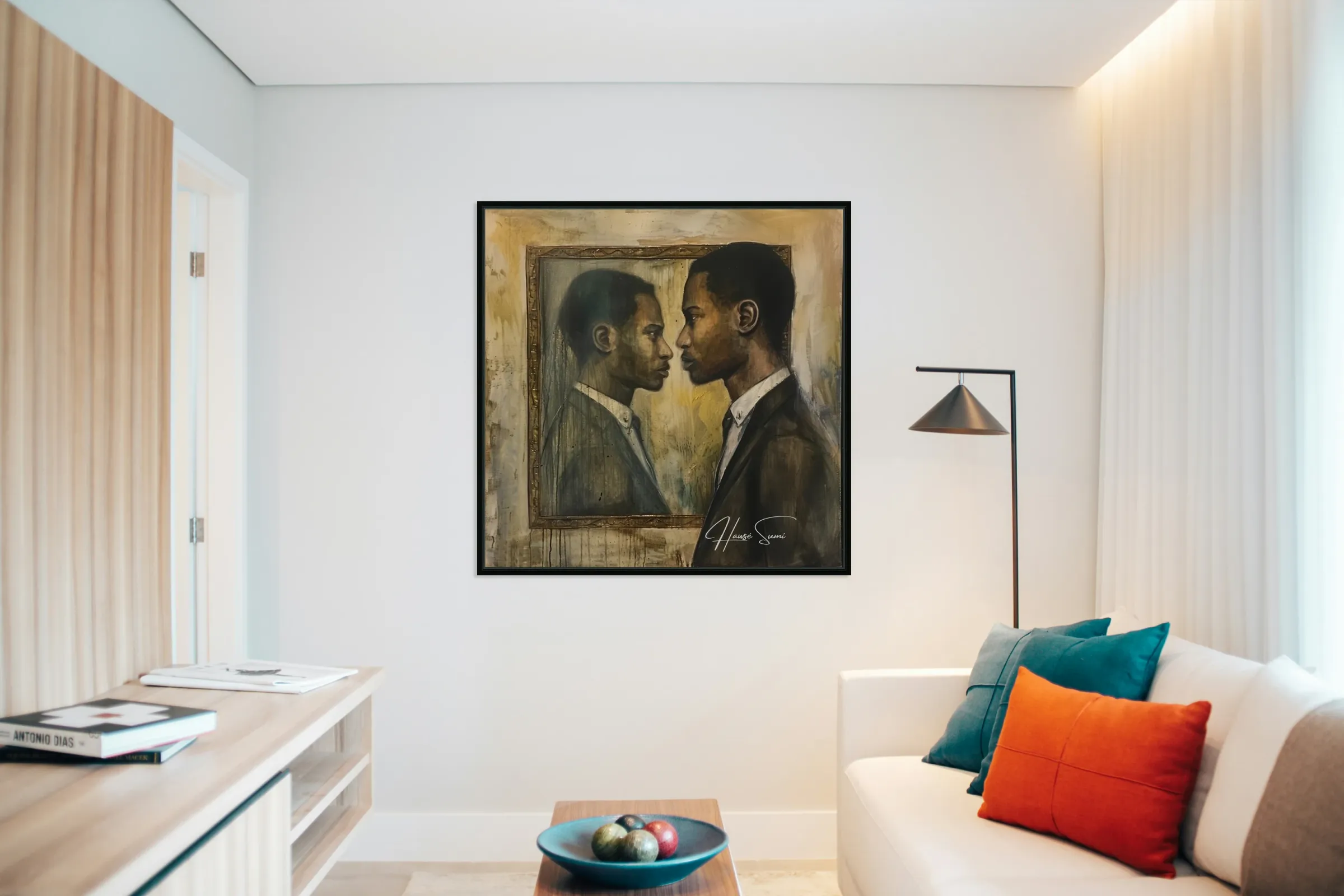 A man in a suit faces his reflection with a determined expression. The artwork captures the resolve and determination that come from within when facin...[+]