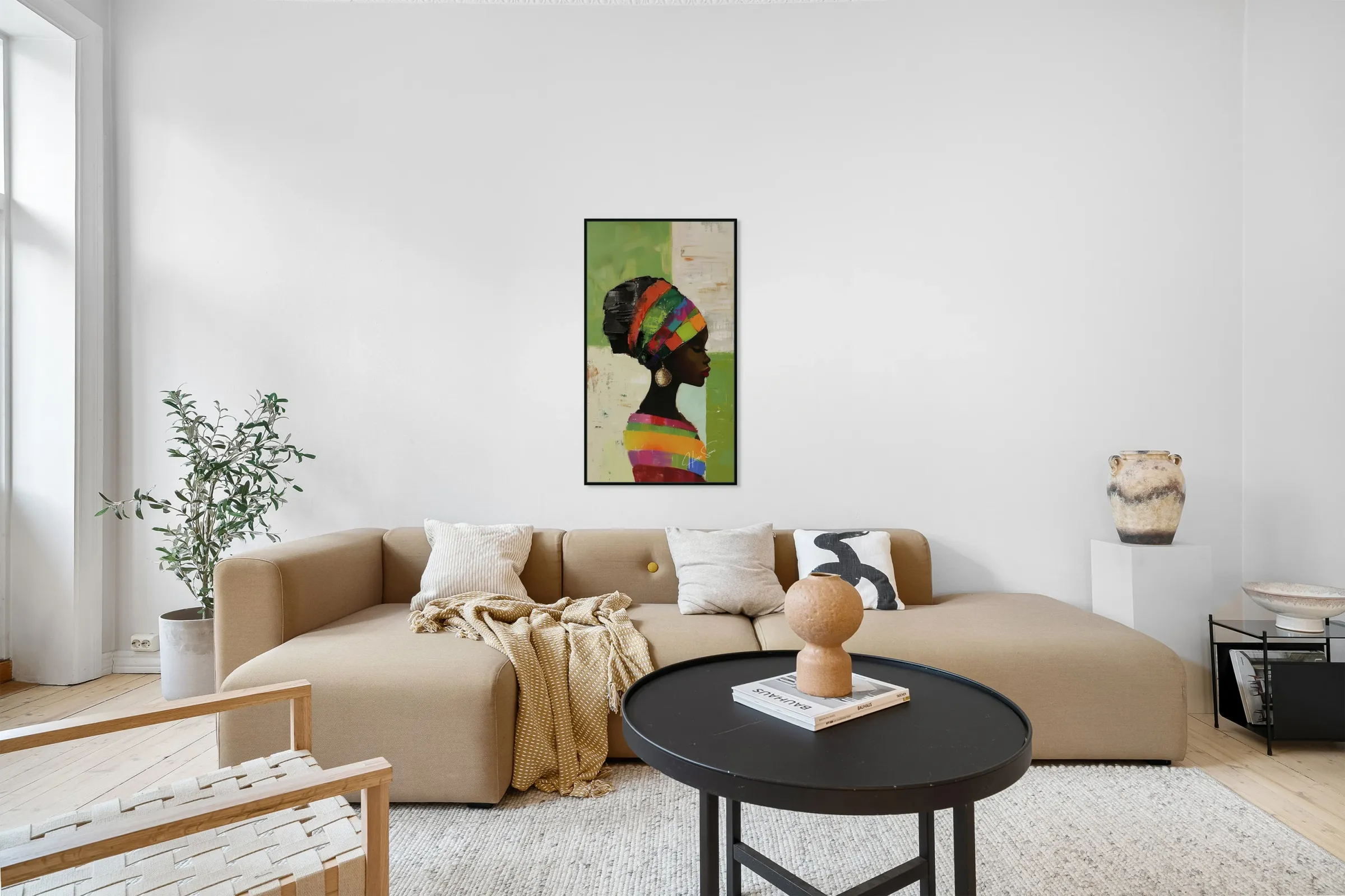 In the heart of a vibrant village, a woman adorned in colorful fabrics and golden earrings stands as a symbol of grace and strength. Her presence is a testament to the beauty and resilience of her heritage, each hue in her attire reflecting the rich culture and traditions of her people. She gazes into the distance, embodying the spirit of generations past and future.