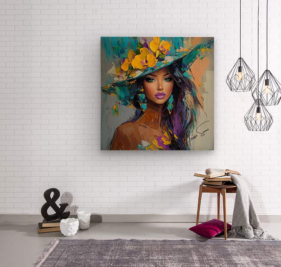 Draped in deep midnight blue and crowned with canary-yellow florals, she stares into the soul with a fierce elegance. Her gaze, framed by emerald shad...[+]